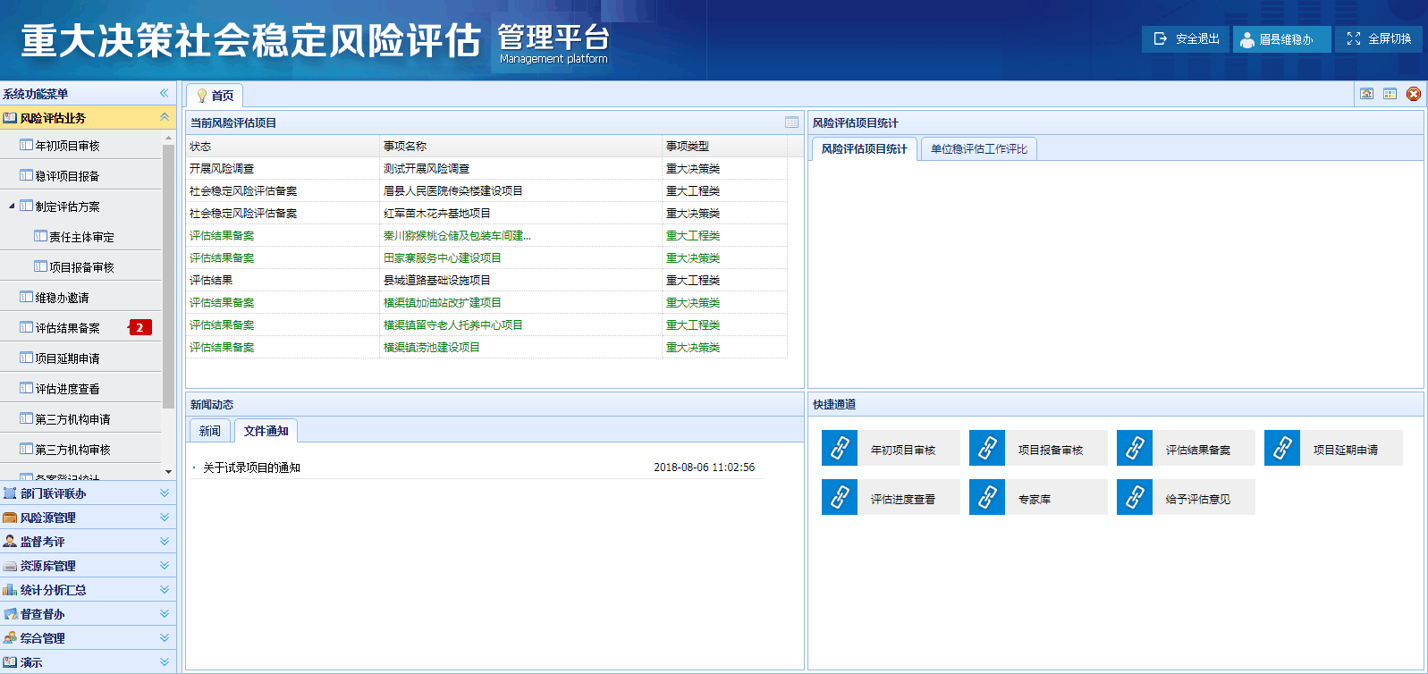 寶雞市領(lǐng)導(dǎo)在考察了南通市維穩(wěn)辦的社會(huì)穩(wěn)定風(fēng)險(xiǎn)評(píng)估系統(tǒng)后,決定在寶雞市建設(shè)該平臺(tái),并決定將眉縣作為試點(diǎn),平臺(tái)實(shí)現(xiàn)眉縣上下、各部門(mén)之間評(píng)估數(shù)據(jù)實(shí)時(shí)反應(yīng)、社會(huì)資源共享共用、部門(mén)聯(lián)動(dòng)協(xié)同評(píng)估,為各級(jí)部門(mén)領(lǐng)導(dǎo)科學(xué)決策提供依據(jù)。眉縣社會(huì)穩(wěn)定風(fēng)險(xiǎn)評(píng)估系統(tǒng)成功落地實(shí)施后,在寶雞市全面推廣。