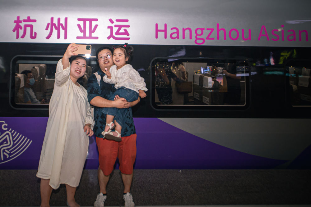 9月16日,在杭州東站站臺(tái),乘客與復(fù)興號(hào)亞運(yùn)智能動(dòng)車(chē)組列車(chē)合影留念。 新華社記者 江漢 攝